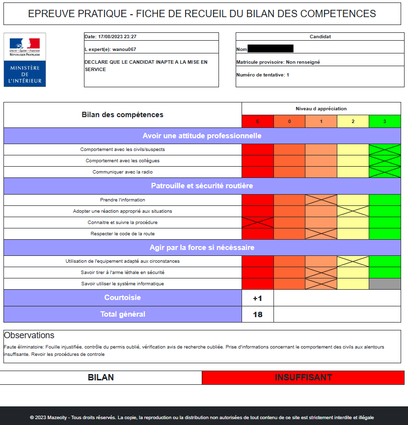 Une fois l'épreuve théorique validée, vous serez mis en attente pour l'épreuve pratique. Les personnes en attente de l'épreuve pratique sont prioritaires sur les personnes en attente de l'épreuve théorique. Une convocation en épreuve pratique ne peut être envoyée, uniquement s'il y a au moins 5 citoyens en ville (Staff, policiers et candidat exclus). L'épreuve pratique dure entre 30 et 50 minutes hors préparation et entretiens de début/fin. Vous devez obtenir une note minimale de 20/31 et ne recevoir aucune note éliminatoire. Si vous réussissez cette épreuve, vous serez immédiatement embauché en tant que recrue, en période d'essai. Les notes éliminatoires sont généralement des fautes suffisament graves pour qu'un agent titulaire puisse être averti, ou blamé. Cela peut également être des erreurs répétées au sein d'un même critère d'évaluation. L'inspecteur vous donnera durant l'épreuve, des instructions et des remarques qu'il faudra prendre en compte. Une remarque ne signifie pas nécéssairement que vous avez échoué, au contraire elle peut vous servir à rebondir pour mieux faire. En cas d'échec vous pouvez vous réinscrire après 24h pour retenter votre chance, dans la limite de 3 essais maximum. (Au delà, il faut repasser l'épreuve théorique). Cliquez ici pour voir un exemple d'une grille d'évaluation.